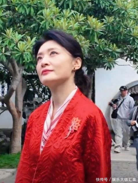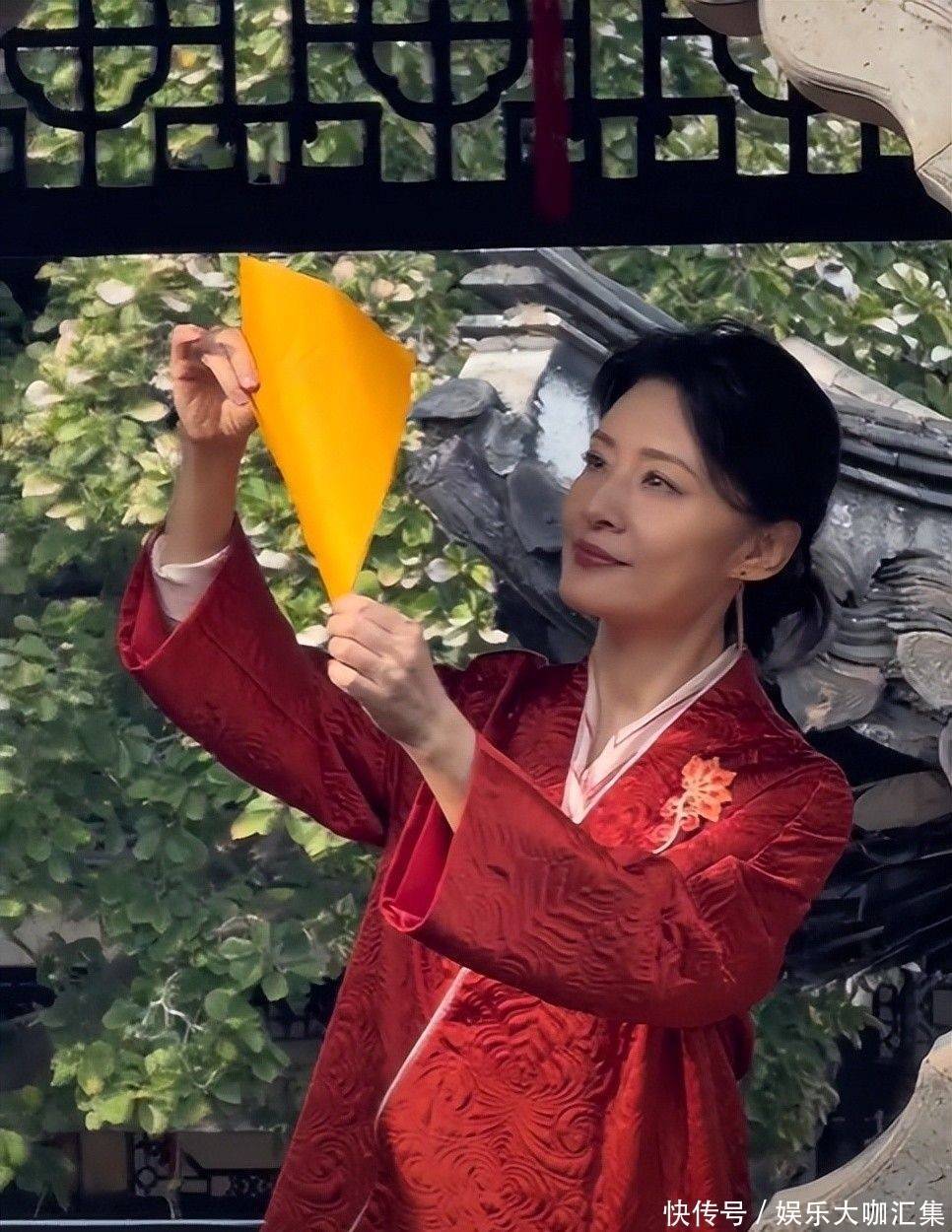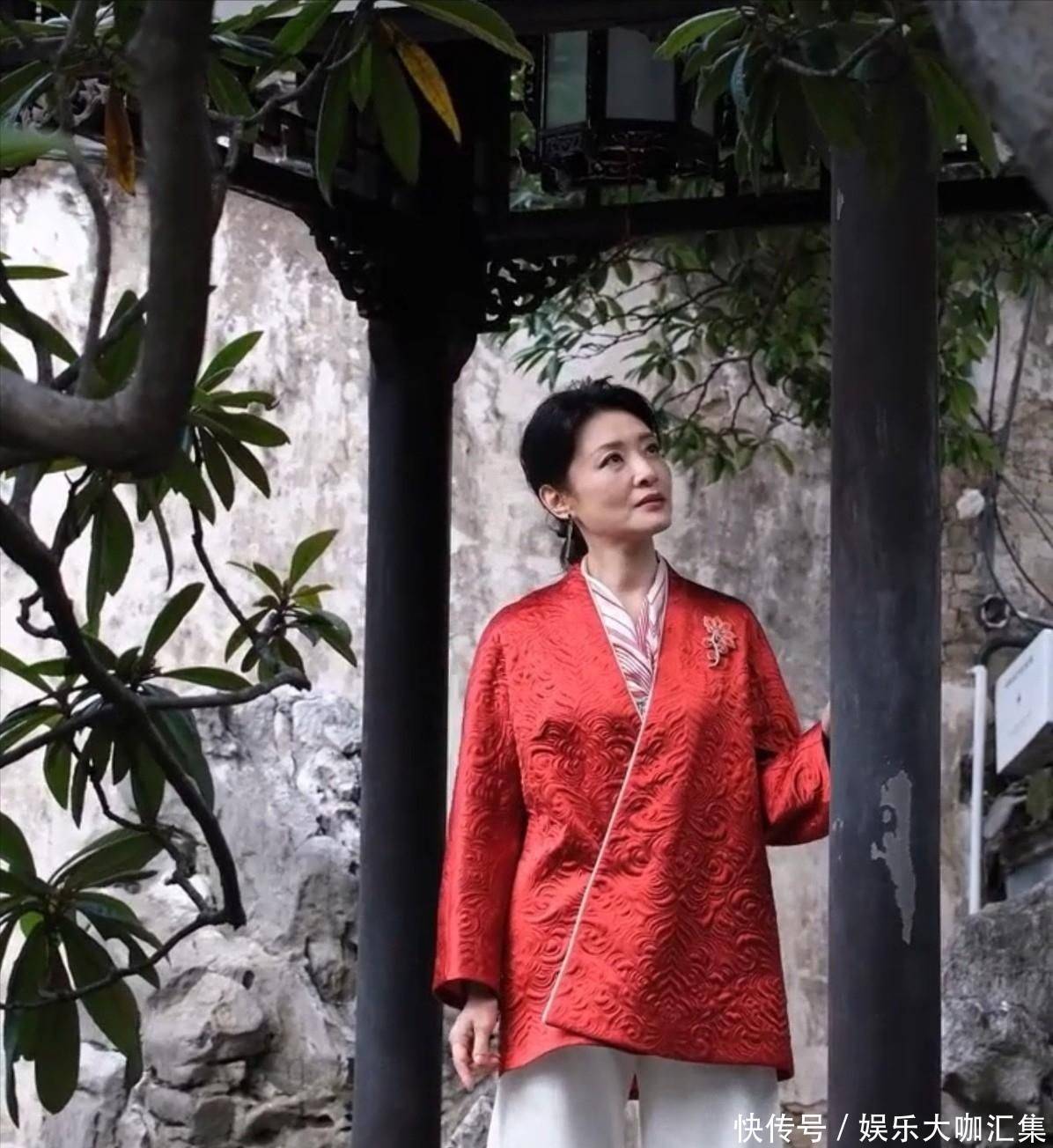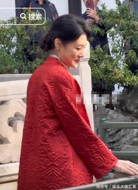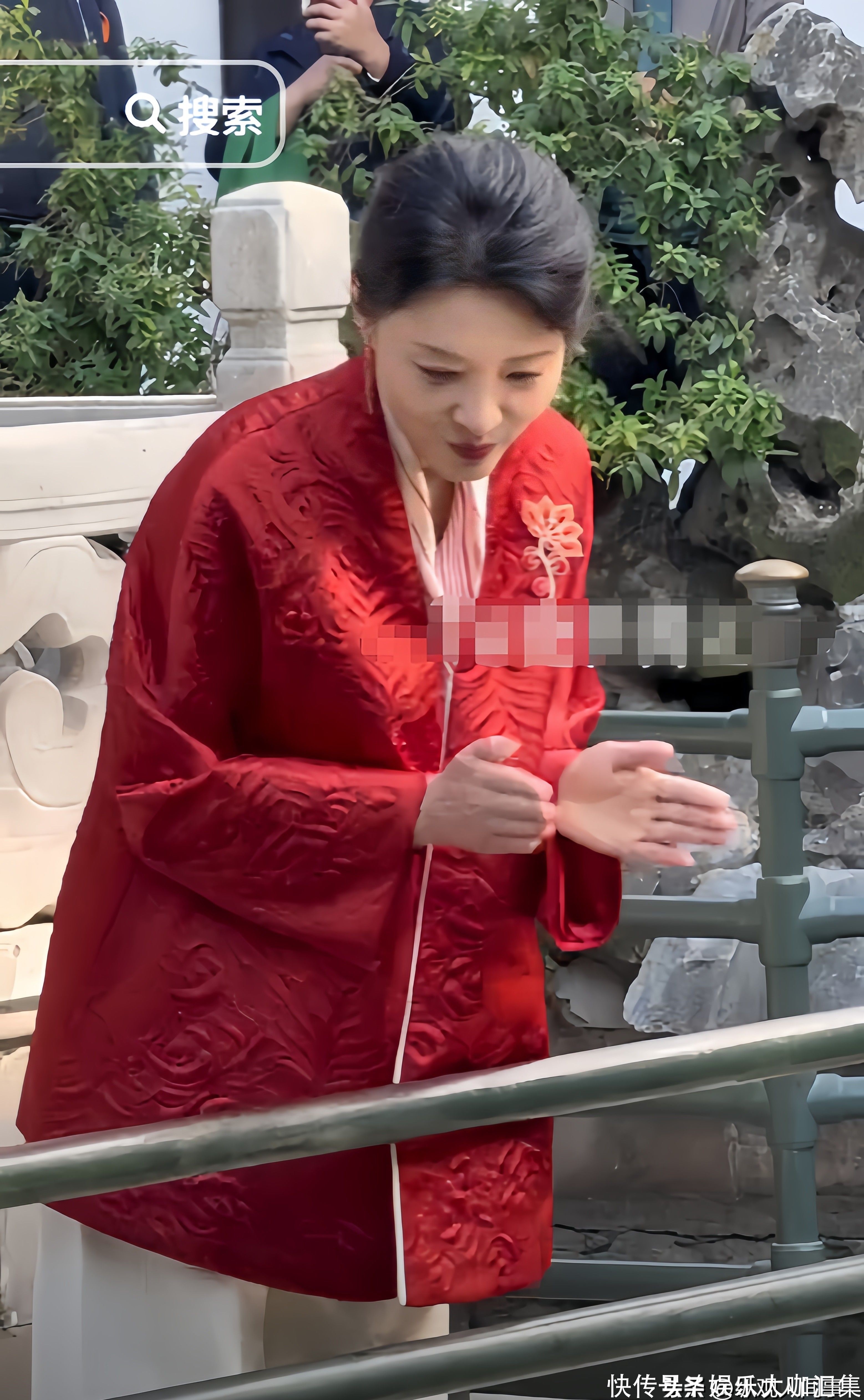 游客用手机抓拍的原片显示,她将长发挽成古典发髻,佩戴银质流苏耳坠,红衣如火,白裤如雪,整体造型极具视觉冲击力。尽管笑起时眼角细纹清晰可见,但身姿挺拔,气场沉稳,仿佛一棵历经风霜却依旧挺立的青松。